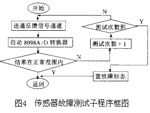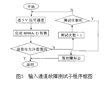 按照電位器具體的安裝工藝,在線路和電位器正常時,電位器的輸出電壓不可能出現(xiàn)0V和5V這2個電壓等級。只有在電位器和連線出現(xiàn)故障時,才會產(chǎn)生0V和5V這2個電壓等級。如果在工作中,在輸入通道無故障的情況下,測得輸入電壓為0V或5V,就說明出現(xiàn)了傳感器故障。當發(fā)現(xiàn)故障時,就可以采取必要的措施及時維修。測試框圖見圖4。