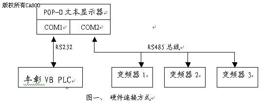 在電氣控制系統(tǒng)中,不同的串口設備往往有自己不同的串口通訊協(xié)議,要把這些具有不同通訊協(xié)議的串口設備都連接到人機接口上的方法只有一個,即要求人機接口設備必須有多個可同時支持不同串口通訊協(xié)議的串行端口。當人機接口設備為工控機時,這一問題很好解決,可以在工控機中加裝多串口卡來實現(xiàn)這一要求,這種方法一般用于大型監(jiān)控系統(tǒng)。而對于小型電氣控制系統(tǒng),如電梯電氣控制系統(tǒng)的人機監(jiān)控,一般可選擇具有多串口通訊功能的人機界面產(chǎn)品,如觸摸型人機界面、文本顯示器等來實現(xiàn)這一要求。在此,文本介紹一種用POP-D型雙串口文本顯示器連接一臺VIGOR PLC和三臺丹佛斯變頻器的工程實例。