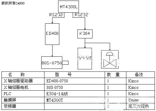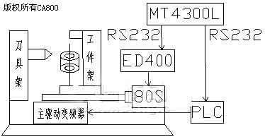 由觸摸屏作為主站,通過RS232與PLC通訊控制,實(shí)現(xiàn)各種工件參數(shù)的設(shè)定,同時(shí)通過觸摸屏獨(dú)立的雙串口協(xié)議功能與伺服通訊,完成對(duì)X軸徑向進(jìn)給運(yùn)動(dòng)控制。