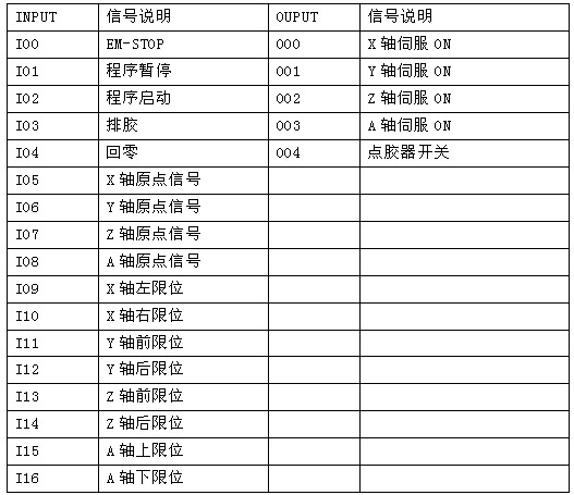 ?。?)數(shù)控系統(tǒng)控制的點膠機(jī)設(shè)備共有四個軸,使用四臺伺服控制器和伺服電機(jī),X軸一臺、Y軸兩臺、Z軸一臺。輸入信號有急停按鈕、手動自動轉(zhuǎn)換按鈕、手動點膠按鈕、暫停按鈕、回零按鈕、左右限位輸入信號及伺服報警信號等共計21個輸入信號。控制流程是使用數(shù)控系統(tǒng)控制四個伺服控制器及伺服電機(jī)、四個點膠器的開關(guān)信號,自動運(yùn)行時Y軸控制的兩個平臺交替工作,X軸和兩個Y軸需要走直線插補(bǔ)或圓弧插補(bǔ),Z軸需要走不同高度的點膠面,更換產(chǎn)品比較頻繁,更換產(chǎn)品后需手動調(diào)整開膠點,然后再進(jìn)行單步動作或自動運(yùn)行。
