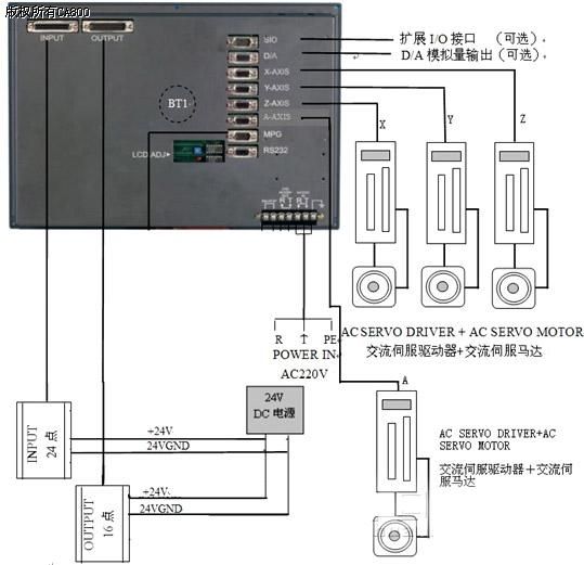 ?。?)點膠機(jī)設(shè)備需要四個軸控制即X、Y(2個)、Z,但是X和Y(2個)要進(jìn)行插補(bǔ)運(yùn)行,而插補(bǔ)運(yùn)行時在G代碼的加工軟件指令中只有X和Y、X和Z、Y和Z,要與CAD等圖形編輯軟件生成的G代碼程序通用就不能使用2個Y軸,因此解決的方式是使用中達(dá)電通的四軸數(shù)控系統(tǒng)(PUTNC-H4-4):X軸控制原來的X軸在橫向運(yùn)動,Y軸控制原來的Y1軸,同橫向的X軸進(jìn)行插補(bǔ)控制第一個點膠平臺,Z軸控制原來的Y2軸,同橫向的X軸進(jìn)行插補(bǔ)控制第二個點膠平臺,A軸控制原來的Z軸走不同高度的點膠面,這樣就可以解決控制系統(tǒng)能直接執(zhí)行CAD等圖形編輯軟件生成的代碼程序。中達(dá)的數(shù)控系統(tǒng)本身具有24個輸入點、16個輸出點,設(shè)備的I/O點也夠使用,中達(dá)的A系列伺服使用的控制理論是最先進(jìn)的強(qiáng)健式的控制理論(PDFF),即使在伺服電機(jī)的負(fù)載慣量大范圍的變化時,伺服系統(tǒng)仍然可以保持優(yōu)異的性能,進(jìn)行流暢、精準(zhǔn)、正確地定位。
