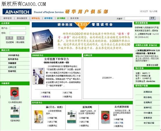 研華,7月 9日,2008 – 本月7日,研華用戶俱樂部全新推出讀書頻道,旨在延續(xù)研華CEO管理讀書會(huì)品牌活動(dòng)。研華用戶俱樂部讀書頻道(以下簡(jiǎn)稱“讀書頻道”)是由研華CEO管理讀書會(huì)延伸而來,由最初內(nèi)部員工活動(dòng)擴(kuò)展到研華與客戶、合作伙伴等外界交流,致力于為廣大用戶快捷、翔實(shí)、提供研華CEO管理讀書會(huì)的相關(guān)信息,突破傳統(tǒng)“讀書”概念,以網(wǎng)絡(luò)形式與更多人分享讀書心得與管理經(jīng)驗(yàn),增進(jìn)研華與用戶、用戶與用戶之間的互動(dòng)交流,傳達(dá)研華“讀書·學(xué)習(xí)·分享”的理念。