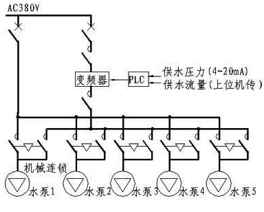 變頻器選用適于泵類的Fuji G9變頻器,分別對(duì)五臺(tái)循環(huán)水泵進(jìn)行變頻控制,并通過PLC的邏輯控制功能,實(shí)現(xiàn)對(duì)整個(gè)供水系統(tǒng)的恒壓變流量控制,為確保系統(tǒng)的穩(wěn)定運(yùn)行,整個(gè)系統(tǒng)設(shè)有過流、過壓、過載、自診斷等多種保護(hù)功能。