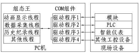 上位機(jī)監(jiān)控軟件利用組態(tài)王(KingView5.1)工控組態(tài)軟件。它能充分利用Windows的圖形編輯功能,方便地構(gòu)成監(jiān)控畫面,并以動(dòng)畫方式顯示控制設(shè)備的狀態(tài),具有報(bào)警窗口、實(shí)時(shí)趨勢(shì)曲線等,可便利的生成各種報(bào)表。它還具有豐富的設(shè)備驅(qū)動(dòng)程序和靈活的組態(tài)方式、數(shù)據(jù)鏈接功能。該軟件把每一臺(tái)下位機(jī)看作是一臺(tái)外部設(shè)備,在編程過程中根據(jù)“設(shè)備配置向?qū)А钡奶崾疽徊讲酵瓿蛇B接功能。在運(yùn)行期間,組態(tài)王通過驅(qū)動(dòng)程序和這些外部設(shè)備交換數(shù)據(jù),包括采集數(shù)據(jù)和發(fā)送數(shù)據(jù)/指令。每個(gè)驅(qū)動(dòng)程序都是一個(gè)COM對(duì)象,這種方式使通信程序和組態(tài)王軟件構(gòu)成一個(gè)完整的系統(tǒng),既保證了運(yùn)行系統(tǒng)的高效運(yùn)行,也可擴(kuò)大系統(tǒng)的規(guī)模。其與下位機(jī)通信原理如圖4所示: