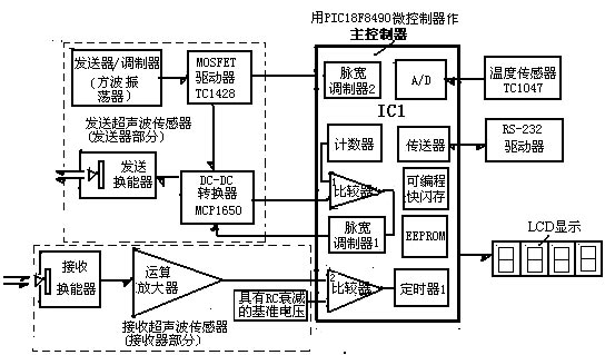 圖3:為用微控制器PIC18F8490作為主控制器(IC1)與發(fā)送超聲傳感器