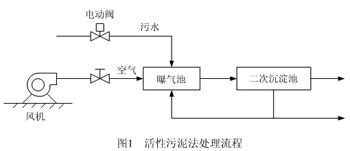 圖1所示為活性污泥處理流程示意圖。SBR廢水處理法初次沉淀池、曝氣池、二次沉淀池、污泥回流和剩余污泥排放幾個系統(tǒng)組成。初次沉淀池用以去除污水中原生懸浮物,懸浮物少時可不設置。污水和回流的活性污泥一起進入曝氣池形成混合液,通過羅茨風機充入空氣,使混合液得到足夠的攪拌而呈懸浮狀態(tài),然后流入沉淀池?;旌弦褐械膽腋」腆w在沉淀池中沉淀下來和水分離,流出沉淀池的凈化水。沉淀池中的污泥大部分回流,成為回流污泥。