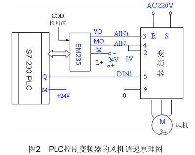 圖2為一種西門子變頻器與PLC相結合實現(xiàn)PID調節(jié)的變頻調速的風機控制系統(tǒng),其中EM235為PLC模擬量I/O擴展模塊。其工作過程是:系統(tǒng)在線檢測的COD值,送入PLC模塊后,進行PID的運算,其模擬量輸出作為變頻器的輸入,控制變頻調速,來達到調整風機轉速,從而實現(xiàn)曝氣量的調節(jié)控制。