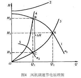 當需要調節(jié)風量時,例如,所需風量從100%減少到額定風量的50%,即從Q1減少到Q2時,如采用調節(jié)風門的方法來調節(jié)風量,使管網(wǎng)阻力曲線由曲線3變?yōu)榍€4。就是說,減小風門開度增加了管網(wǎng)阻力。此時,系統(tǒng)的工作點由原來的A點移至B點??梢钥闯?,風量雖然降低了,但風壓增加了,軸功率Ps2與面積BH2 OQ2成正比,它與Ps1相比,減少不多。
