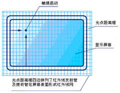 IRTOUCH紅外觸摸屏的工作原理是在觸摸屏的四周布滿紅外接收管和紅外發(fā)射管,這些紅外管在觸摸屏表面呈一一對(duì)應(yīng)的排列關(guān)系,形成一張由紅外線布成的光網(wǎng),當(dāng)有物體(手指、帶手套或任何觸摸物體)進(jìn)入紅外光網(wǎng)阻擋住某處的紅外線發(fā)射接收時(shí),此點(diǎn)橫豎兩個(gè)方向的接收管收到的紅外線的強(qiáng)弱就會(huì)發(fā)生變化,設(shè)備通過(guò)了解紅外線的接收情況的變化就能知道何處進(jìn)行了觸摸。由于IRTOUCH紅外觸摸屏本身的工作原理,使用時(shí)可以做到無(wú)壓力(指觸摸體對(duì)觸摸屏本身施加的壓力)觸摸工作,因此IRTOUCH觸摸屏可以做到無(wú)玻璃工作。