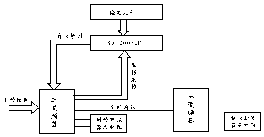系統(tǒng)使用ABB的兩臺(tái)變頻器,采用主從傳動(dòng),DTC(直接轉(zhuǎn)矩控制方式)控制方式,主變頻器與其從變頻器之間采用光纖通訊,所有來(lái)自外部的數(shù)字、模擬輸入只進(jìn)入主變頻器,主變頻器接到外部指令后,其從變頻器立即作出與主變頻器一致的啟動(dòng)、運(yùn)行、速度、力矩、電氣制動(dòng)等緊緊跟隨。該系統(tǒng)的速度監(jiān)視功能使電氣制動(dòng)到零速時(shí)快速實(shí)現(xiàn)機(jī)械制動(dòng),轉(zhuǎn)矩監(jiān)視功能不但保護(hù)了變頻器,還為系統(tǒng)確定了鐵牛撞上重車(chē)并拽穩(wěn)重車(chē)后使鐵牛自動(dòng)牽引車(chē)皮往液壓平臺(tái)方向運(yùn)行的信號(hào)。主從傳動(dòng)方式中的速度、力矩控制使系統(tǒng)實(shí)現(xiàn)了兩臺(tái)到多臺(tái)電機(jī)的速度、力矩的平均分配,DTC控制使變頻器實(shí)現(xiàn)了對(duì)電機(jī)的精確的力矩控制,電氣制動(dòng)加機(jī)械制動(dòng)滿(mǎn)足了系統(tǒng)的快停和準(zhǔn)確定位要求。手動(dòng)加自動(dòng)控制系統(tǒng)確保了系統(tǒng)的高效連續(xù)可靠運(yùn)行。