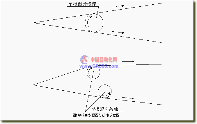 大多數(shù)漿紗機(jī)都用單根濕分絞棒,將片紗分成二層,如圖1(a)所示,上層紗運(yùn)動方向與濕分絞棒轉(zhuǎn)動方向一致;下層紗運(yùn)動方向與濕分絞棒轉(zhuǎn)動方向相反。因此下層紗容易從漿紗上把漿液抹下來,是濕分絞棒粘漿的來源,而且下層紗的紗線相對容易纏繞在濕分絞棒上。如果按圖(b)所示,采用雙根濕分絞棒,轉(zhuǎn)動方向與紗線運(yùn)動方向一致的辦法,這樣雙根分絞棒分別與上下層紗片接觸,速差一致,抹紗均勻,如果濕分絞棒內(nèi)腔再通上冷水,效果就更加理想。