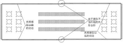 數(shù)控沖在加工中,由于毛坯料的定位邊直線度不好,夾鉗位置、壓料塊的位置不當(dāng),外形加工時很容易出現(xiàn)臺階,各個型孔距邊的尺寸公差也難以保證,如圖3所示。