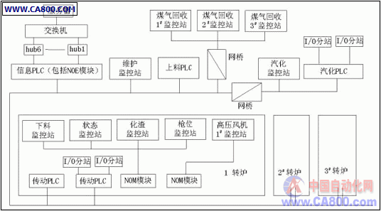 轉爐自動化控制系統(tǒng)通信網絡采用的是多層網結構,主要由 Modbus Plus (MB+)網構成,以求減少系統(tǒng)間的相互影響。Modbus Plus網通過使用低成本的雙絞線電纜使得計算機、控制器和其它數(shù)據源,在整個網絡上作為同位體進行通信。本體PLC和汽化PLC與遠程I/O站之間通信選用冗余的同軸電纜通過通信模塊進行通信。每座轉爐本身內各PLC和監(jiān)控站之間的通信采用在PLC上加通信模塊NOM的方案,在監(jiān)控站安裝SA85網卡,與NOM模塊上Modbus Plus接口組成Modbus Plus網。網絡分級通過NOM模塊完成,依靠網橋可完成ModbusPlus網絡分段。這樣,3座轉爐間通信網就具有三段Plus網,和兩級網絡設置,其作用是提高網絡總體運行速度,并減少主體生產設備控制系統(tǒng)網絡出現(xiàn)故障的風險。