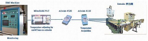 在擠壓機中,每一個溫度檢測點通過熱電偶接入ADAM-4118進行測量,同時將溫度數(shù)據(jù)傳送到PLC中進行系統(tǒng)監(jiān)測和控制。同時,PLC再將溫度數(shù)據(jù)送到HMI觸摸屏中實時顯示溫度。