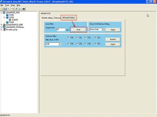 研華的工程師到現(xiàn)場后將ADAM-4018+更換為ADAM-4118,并進行如下的簡單配置后,解決了電機啟動時溫度采集跳變的問題。