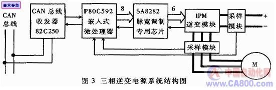 CAN通信網(wǎng)絡(luò)的引入為電動車的全局優(yōu)化控制提供了條件,車輛的每個(gè)子系統(tǒng)都因此成為整車控制中的智能節(jié)點(diǎn)。采用集成CAN控制器的P8xC592單片機(jī)作為控制核心,結(jié)合SA8282專用PWM波形發(fā)生芯片設(shè)計(jì)出的電動車用輔助三相逆變電源,不僅安全穩(wěn)定性高,還能夠充分參與整車的數(shù)據(jù)交換和控制。對于采用不同CAN總線協(xié)議的電動車輛,只需適當(dāng)修改控制程序中有關(guān)CAN通訊的部分程序段,就可以順利接入整車系統(tǒng),使該逆變電源具有更強(qiáng)的通用性。