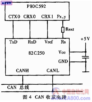 CAN總線收發(fā)器82C250是CAN控制器和物理總線間的接口,最初為汽車高速通信設(shè)計(jì),具許多針對車輛應(yīng)用設(shè)計(jì)的結(jié)構(gòu)。其特點(diǎn)包括:有效減小汽車環(huán)境瞬間干擾對信號的影響,具有保護(hù)總線能力;防護(hù)電池與地之間發(fā)生短路;支持低電流待機(jī)方式等,因此十分適合電動車輔助逆變電源的需要。將82C250與P80C592的CAN接口輸入、輸出端相連,便構(gòu)成了輔助逆變電源對外通訊的接口,如圖4所示。