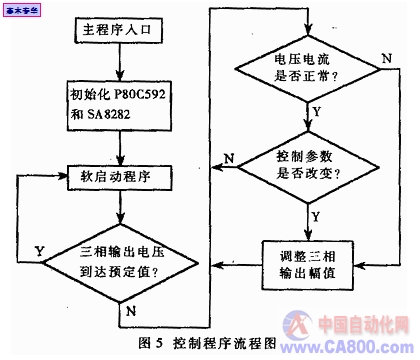 輔助三相逆變電源的控制軟件通過8051匯編語言編制,在完成其控制功能外,力求程序的合理與簡化,以適應(yīng)電動汽車對系統(tǒng)穩(wěn)定性和可靠性的要求,控制流程如圖5所示。