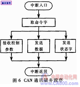 CAN總線通訊程序包含若干子程序,其基本程序結(jié)構(gòu)如圖6所示。當(dāng)通訊程序觸發(fā)后,P80C592的CAN控制器提據(jù)命令字執(zhí)行相關(guān)任務(wù)。當(dāng)上位機(jī)請求數(shù)據(jù)時(shí),將逆變電源的各項(xiàng)運(yùn)行參數(shù)傳輸給整車系統(tǒng);當(dāng)上位機(jī)查詢節(jié)點(diǎn)狀態(tài)時(shí),將當(dāng)前CAN節(jié)點(diǎn)狀態(tài)等數(shù)據(jù)發(fā)磅出去;當(dāng)上位機(jī)要求修改運(yùn)行參數(shù)時(shí),將接收的數(shù)據(jù)參數(shù)存入數(shù)據(jù)存儲器。