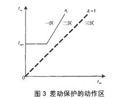 根據(jù)差動保護(hù)中動作電流與制動電流的比值A的大小,可以將差動保護(hù)的動作區(qū)分為三部分,如圖3所示。