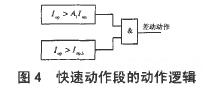 在原來的差動保護(hù)的動作特性的基礎(chǔ)上,設(shè)置差動 保護(hù)的快速動作段,由于A>1.1不需要任何閉鎖邏輯,變壓器區(qū)內(nèi)嚴(yán)重故障時的差動保護(hù)的動作時間由故障電流和采用的算法決定,如果采用快速算法,其典型的動作時間為10 ms左右,達(dá)到了快速切除變壓器區(qū)內(nèi)嚴(yán)重故障,保證變壓器安全和電網(wǎng)穩(wěn)定。該動作段的動作邏輯如下: