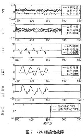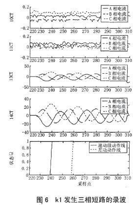 圖6縱坐標(biāo)的電流單位為安培,橫坐標(biāo)為采樣點(diǎn)數(shù)(一個電流周期內(nèi)采24點(diǎn))。圖6中黑色為差動保護(hù)快速動作段的動作曲線,動作時間為12ms “一一”為差動保護(hù)動作線,動作時間為28.5ms。圖 7縱坐標(biāo)的電流單位為安培,橫坐標(biāo)為采樣點(diǎn)數(shù)(一個電流周期內(nèi)采24點(diǎn))。圖7中“一一”為差動保護(hù)快速動作段的動作線,黑色為差流速斷動作線,動作時間為12ms。