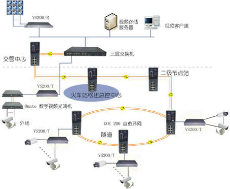 此系統(tǒng)用于火車站周邊交通狀況監(jiān)視和控制,GOE200千兆工業(yè)級以太網(wǎng)機交換機搭建子系統(tǒng)骨干傳輸網(wǎng)絡(luò),隧道視頻傳輸由VS200視頻編碼器編碼,通過GOE200千兆環(huán)網(wǎng)將視頻流上傳,至火車站樞紐總控中心的網(wǎng)絡(luò)視頻服務(wù)器上,通過骨干網(wǎng)與交管局監(jiān)控中心網(wǎng)絡(luò)視頻服務(wù)器客戶端連接;外場視頻通過視頻光端機傳至交管中心,再經(jīng)VS200接入三層交換機,兩中心都可以實時對站邊環(huán)境進行監(jiān)控管理。