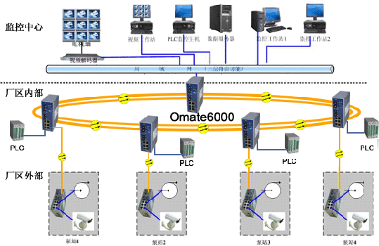 PLC的數(shù)據(jù)通過(guò)Omate6000構(gòu)建的百兆交換網(wǎng)絡(luò)傳輸?shù)奖O(jiān)控中心,使管理者可在由遠(yuǎn)程監(jiān)控計(jì)算機(jī)及數(shù)據(jù)收集設(shè)備,了解現(xiàn)場(chǎng)水質(zhì)標(biāo)準(zhǔn)、PH因子、水溫等的實(shí)時(shí)信息。廠區(qū)外面的泵站有電機(jī),攝像機(jī)等設(shè)備,通過(guò)接入交換網(wǎng)絡(luò),可以在中央控制房有效地監(jiān)視和控制。