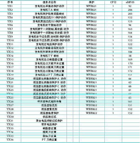 本繼電保護(hù)系統(tǒng)的主要監(jiān)測(cè)對(duì)象包括:一臺(tái)發(fā)電機(jī)組、一臺(tái)主變壓器、兩回10kV出線、400V廠用變;保護(hù)對(duì)象包括電站的發(fā)電機(jī)、變壓器、10kV出線。該繼電保護(hù)系統(tǒng)提供一智能通訊服務(wù)器,其功能是將許繼設(shè)備的通訊規(guī)約轉(zhuǎn)換為MODBUS規(guī)約,預(yù)留RS-485通訊接口與CP340進(jìn)行通訊。通訊的數(shù)據(jù)量包括遙信信息點(diǎn)(功能碼02,起始查詢地址0):YX1~YX36,祥見表1。遙測(cè)信息點(diǎn)(功能碼03,起始查詢地址0)YC1~YC18,祥見表2。