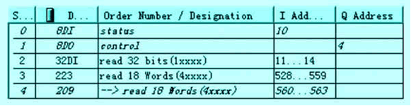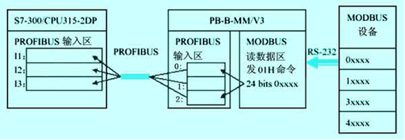 其中,I1..I3是PROFIBUS主站分配給這個(gè)MODBUS模塊的PROFIBUS輸入地址I1~I3,對(duì)應(yīng)本MODBUS報(bào)文讀到的24 bits (0xxxx)。這樣,PLC在進(jìn)行編程時(shí),直接讀取I1~I3即可得到MODBUS 的24個(gè)輸出線圈0xxxx的狀態(tài)。