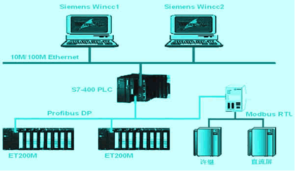 在本自動(dòng)控制系統(tǒng)中,將西門子S7-400 PLC作PROFIBUS主站,ET 200M和PB-M網(wǎng)橋作PROFIBUS從站。另一方面,在Modbus總線中將PB-M網(wǎng)橋作Modbus主站,繼電保護(hù)裝置和直流屏設(shè)備作為Modbus的從站,雙方以9600bps的通訊速率進(jìn)行通訊。具體的網(wǎng)絡(luò)結(jié)構(gòu)如圖1所示: