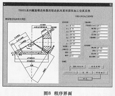 根據(jù)YH603系列螺旋錐齒輪數(shù)控銑齒機(jī)加工參數(shù)類型,開(kāi)發(fā)仿真程序界面如圖8。界面由三部分組成:(1)參數(shù)對(duì)照區(qū)。螺旋錐齒輪加工參數(shù)很多,將各個(gè)參數(shù)以圖例的形式表示方便參數(shù)輸入,防止參數(shù)輸入錯(cuò)誤;(2)參數(shù)輸入?yún)^(qū);(3)程序操作區(qū)。