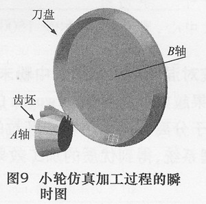 對(duì)于數(shù)控銑齒機(jī)床加工,調(diào)整過(guò)程和加工全過(guò)程都由數(shù)控軸運(yùn)動(dòng)實(shí)現(xiàn),所以仿真該機(jī)床的運(yùn)動(dòng)實(shí)際上就是仿真機(jī)床五個(gè)數(shù)控軸的運(yùn)動(dòng)。在CATIA V5中仿真螺旋錐齒輪的加工過(guò)程,可首先在仿真系統(tǒng)中取和機(jī)床相同坐標(biāo)系;接著直接用盤(pán)銑刀幾何模型繞搖臺(tái)軸線的轉(zhuǎn)動(dòng)代表機(jī)床X、Y方向的兩個(gè)平動(dòng);最后用刀盤(pán)幾何模型繞齒坯幾何模型的轉(zhuǎn)動(dòng)代表A軸運(yùn)動(dòng)。完整的仿真系統(tǒng)實(shí)現(xiàn)過(guò)程為:首先根據(jù)工件齒輪參數(shù)和盤(pán)銑刀參數(shù)生成齒輪毛坯實(shí)體和盤(pán)銑刀實(shí)體;接著根據(jù)一組數(shù)控軸聯(lián)動(dòng)參數(shù)相應(yīng)調(diào)整齒輪毛坯實(shí)體位置和盤(pán)銑刀位置,同時(shí)兩個(gè)實(shí)體做相減布爾運(yùn)算,繼續(xù)讀取聯(lián)動(dòng)數(shù)據(jù)直到加工完一個(gè)齒槽;齒輪毛坯繞自身軸線分度加工下一個(gè)齒槽,直到加工完所有齒槽。由于仿真過(guò)程是將加工過(guò)程離散化,如用手工操作實(shí)現(xiàn)工作量大,也不能動(dòng)態(tài)演示加工過(guò)程。在CATIA V5中可通過(guò)其方便的二次開(kāi)發(fā)功能,開(kāi)發(fā)出相應(yīng)的加工仿真系統(tǒng)實(shí)現(xiàn)加工過(guò)程由程序來(lái)控制。
