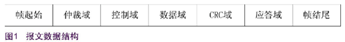 CAN是一個典型的以半雙工方式通信的串行總線結(jié)構(gòu)形式,一個節(jié)點發(fā)送信息,多個節(jié)點接收信息。不同于主從式總線,CAN采用一種稱作廣播式的存取工作方式,是一種對等式的總線網(wǎng)。在CAN總線的通信協(xié)議中,各節(jié)點地址沒有主/從的概念,也沒有任何與節(jié)點地址相關(guān)的信息存在。信息以報文的形式出現(xiàn),其數(shù)據(jù)結(jié)構(gòu)如圖1所示。