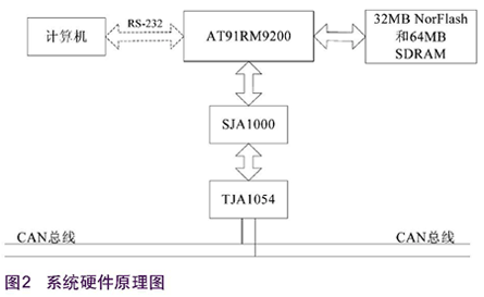 處理器采用ATMEL公司基于ARM920T內(nèi)核的AT91RM9200,該處理器運行頻率高達180MHz,可外擴32MB Flash和64MB RAM,使其可以滿足大多數(shù)汽車CAN節(jié)點的測試需求。片上集成了許多標準接口,如USB主/從接口、以太網(wǎng)、RS-232,使其可以簡單得與PC機相連,測試數(shù)據(jù)可以實時地上傳到PC機,借助PC機強大的處理性能和豐富的數(shù)據(jù)處理軟件,進行在線監(jiān)測及數(shù)據(jù)處理。