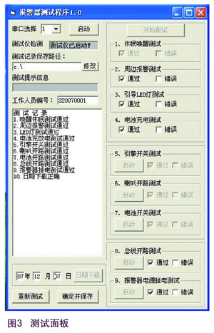 軟件設(shè)計包括上位機程序和下位機程序兩個部分。上位機程序在NI公司專門針對虛擬儀器開發(fā)設(shè)計的的Labwindows/CVI平臺上開發(fā),包括USB通訊程序和測試程序兩個部分。labwindows/CVI包括對眾多總線(包括PCI、PCI Express、PXI、PCMCIA、USB、以太網(wǎng)、GPIB、串口和IEEE 1394)的支持,可以方便得開發(fā)RS232通訊程序。測試程序包括人機交互界面(即儀器面板)和測試記錄兩個部分,Labwindows/CVI提供了豐富的控件,可以迅速開發(fā)儀器面板,省去了在下位機上開發(fā)人機交互界面(主要是指LCD和按鍵),所開發(fā)的儀器面板界面如下圖所示: