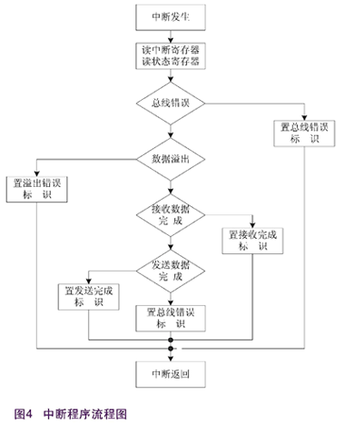 接收數(shù)據(jù)和發(fā)送數(shù)據(jù)均采用中斷來實現(xiàn),基于中斷的數(shù)據(jù)處理流程是CAN通訊程序的重點,其具體實現(xiàn)流程如圖4所示: