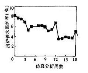 美國的Foundry Service公司(FSC)為了將其熔化設備的熔化能力從每爐1350kg增加到2000kg,計劃增加一個大型澆包和相應澆包運輸設備,目的是減少鐵液輸送系統對熔化能力的制約。該公司利用Witness仿真軟件包建立了一個包括給料、預熱、熔化、出鐵液、鐵液的運輸、澆注以及造型的完整工藝過程的仿真模型。這個模型還通過和AutoCAD接口獲取車間的布局信息,從而得到各種設備的位置和距離。這個模型的數據是建立在各種設備的生產報告、維修報告和生產計劃等數據統計結果上的。但是,在得到的仿真分析結果中出現了與預期相反的結論。仿真分析表明,爐料的增加與快速的出鐵液周期相抵觸,在三次快速出鐵液之后,熔化爐就只能起到鐵液容器的作用,直到下一次或兩次出鐵液后才能繼續(xù)向熔化爐中填料,這就會導致在生產周期中有一段時間生產線得不到鐵液供應。仿真分析表明,適當的減少爐料加入量并調整每次加爐料后取鐵液的量和次數,會加快鐵液供應的周期,減少熔化工段對生產效率的制約。仿真分析鐵液出爐率結果如圖3所示。由圖3可以看出,仿真分析過程中不斷調整鐵液的回爐量,當回爐量下降到改造前的58.4%時,可以使造型線的生產率提高22.1%。按照仿真結果更改設備參數后的生產實驗支持了仿真結果。FSC公司成功地利用虛擬制造技術完成了生產系統的投資改造,并避免了不必要的熔化設備的投資。