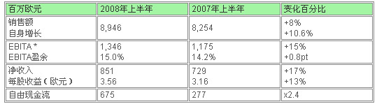 在2008年上半年,盡管有成本方面的通脹壓力以及不利的匯率形勢(shì),自身產(chǎn)量增長(zhǎng)、價(jià)格上升以及生產(chǎn)率還是共同推動(dòng)了業(yè)績(jī)的顯著提高。EBITA提高15%,達(dá)到13.46億歐元。