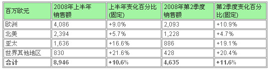 在2008年第2季度,銷售額總計(jì)達(dá)到46.35億歐元,按固定結(jié)構(gòu)和匯率計(jì)算增長(zhǎng)11.6%,按工作日調(diào)整后為增長(zhǎng)10.1%。集團(tuán)所實(shí)現(xiàn)的業(yè)績(jī)與第1季度類似。