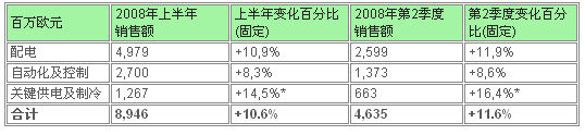 EBITA盈余在2008年上半年上升0.8個(gè)百分點(diǎn),達(dá)到15.0%的創(chuàng)紀(jì)錄水平。這一盈利能力的改善由歐洲和亞太地區(qū)引領(lǐng),這兩大地區(qū)的盈余分別上升1.3個(gè)和3.1個(gè)百分點(diǎn)。所有業(yè)務(wù)(配電、自動(dòng)化及控制、關(guān)鍵供電)也都實(shí)現(xiàn)了盈余提高。