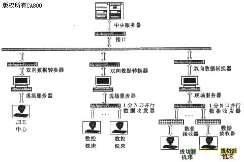 現場服務器可同時服務于多臺數控設備,根據需要在車間一定的空間范圍內(比如:一個小的工作間,一個小的局部區(qū)域)設置網絡節(jié)點,放置一臺PC機作為現場服務器,一臺服務器根據實際需要靠選用1分N口并行數據收發(fā)器來服務于多臺數控設備。