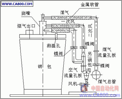 原空、煤氣管道系統(tǒng)缺乏必要的檢測(cè)調(diào)節(jié)裝置。為了實(shí)現(xiàn)烘烤溫度控制,增設(shè)了基本的計(jì)量和調(diào)節(jié)設(shè)備。每套鋼包烘烤裝置所需檢測(cè)控制設(shè)備主要包括:流量計(jì)2個(gè)(空氣、煤氣);調(diào)節(jié)閥3個(gè);高溫?zé)犭娕?支;溫度指示表1臺(tái);流量指示儀2臺(tái)。