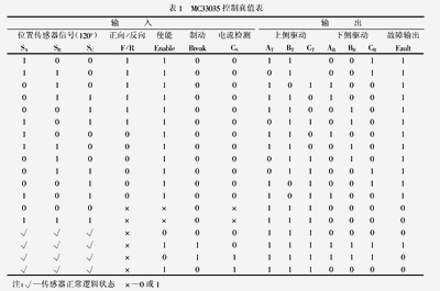由于 3 個(gè)輸入邏輯信號(hào),可有 8 種邏輯組合。其中 6 種正常狀態(tài)決定了電動(dòng)機(jī) , 個(gè)不同位置狀態(tài)。其余 2 種組合對應(yīng)于位置傳感不正常狀態(tài),即 3 個(gè)信號(hào)線開路或?qū)Φ囟搪窢顟B(tài),此時(shí)腳 14 將輸出故障信號(hào)(低電平)。