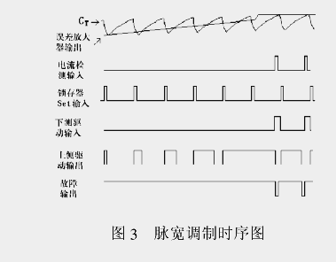 除非由于過電流或故障狀態(tài)使 6 個(gè)驅(qū)動(dòng)輸出調(diào)閉鎖,在正常情況下,誤差放大器輸出與振蕩器輸出鋸齒波信號(hào)比較后,產(chǎn)生脈寬調(diào)制( PWM )信號(hào),控制 3 個(gè)下側(cè)驅(qū)動(dòng)輸出。改變輸出脈沖寬度,相當(dāng)于改變供給電動(dòng)機(jī)繞組的平均電壓,從而控制其轉(zhuǎn)速和轉(zhuǎn)矩。脈寬調(diào)制時(shí)序圖,如圖 3 示。