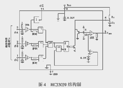 從 MC33039 結(jié)構(gòu)圖圖 4 可知,腳 1 、 2、 3 接收位置傳感器 3 個(gè)信號(hào),經(jīng)有滯后的緩沖電路,以抑制輸入噪聲。經(jīng)“或”運(yùn)算得到相當(dāng)于電動(dòng)機(jī)每對極下 6 個(gè)脈沖的信號(hào)。再經(jīng)有外接定時(shí)元件 CT 和 Rr 的單穩(wěn)態(tài)電路,從腳 5 輸出的 fout 信號(hào)的