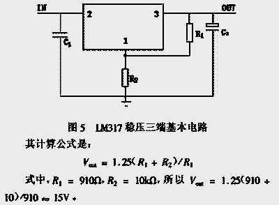 首先要作調(diào)整的是電源。試驗(yàn)中選用的電機(jī)是三相六極電機(jī),n0 = 1500r/min, I0 = 10A, U0 = 50V 。在供電電源和 MC33035 的 腳 17 之 間 加 入 LM317 穩(wěn) 壓 三 端 以 保證MC33035的Vcc在許可的范圍內(nèi)。LM317 是 50V 輸入、 15V 輸出的穩(wěn)壓三端。它的基本電路結(jié)構(gòu),如圖 5 示。