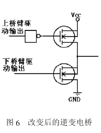 另外,因無法做成圖 1 所示的 NPN-PNP 逆變橋。故用了 N 溝道的 VMOS 管,可組成六路逆變橋的電路,由于上側(cè)驅(qū)動(dòng)信號(hào)只能直接驅(qū)動(dòng) p 溝道的 VMOS 管而下側(cè)可直接驅(qū)動(dòng) N 溝道的 VMOS 管。因而上橋臂與逆變橋之間的電路中加入反相器將驅(qū)動(dòng)信號(hào)變非即可。組成后的電路圖,如圖 6 示。