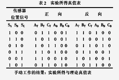在電機(jī)實(shí)際操作之前,以手動(dòng)方式轉(zhuǎn)動(dòng)電機(jī),用萬用表測量電機(jī)上設(shè)置的霍爾傳感器的三路輸出信號(hào)與 MC33035 輸出信號(hào)真值表是否一致。實(shí)驗(yàn)結(jié)果,如表 2 示。