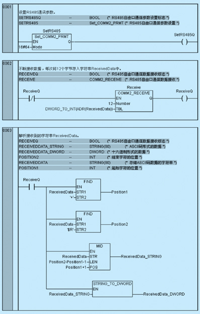 4.1 數(shù)據(jù)解析程序的變量定義 PROGRAM PLC_PRG VAR SetRS-485: Set_COMM2_PRMT; (* RS-485自由口通信參數(shù)設置 *) SetRS-485Q: BOOL; (* RS-485自由口通信參數(shù)設置標志 *) Receive: COMM2_RECEIVE; (* RS-485自由口通信數(shù)據(jù)接收 *) ReceiveQ: BOOL; (* RS-485自由口通信數(shù)據(jù)接收標志 *) ReceivedData: STRING; (* 存儲ASCII碼數(shù)據(jù)的字符串 *) Position1: INT; (* 起始字符的位置 *) Position2: INT; (* 結(jié)束字符的位置 *) ReceivedData_STRING: STRING; (* ASCII碼形式的數(shù)據(jù) *) ReceivedData_DWORD: DWORD; (* 十六進制形式的數(shù)據(jù) *) END_VAR 4.2 數(shù)據(jù)解析程序的梯形圖 如圖2所示。